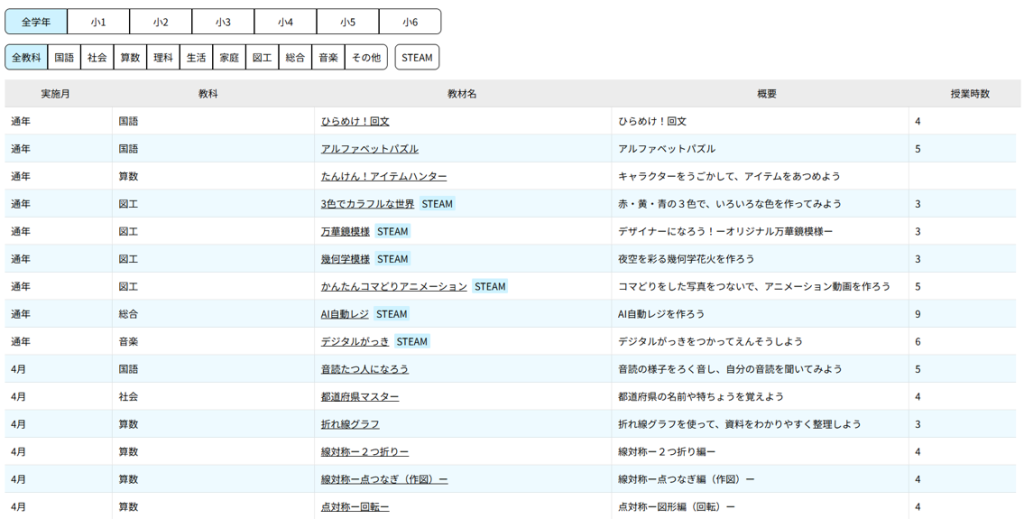 表示中の年間カリキュラムから、教材名と概要を閲覧できます。