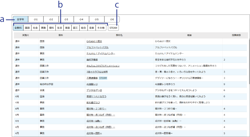 サイドバーで「年間カリキュラム」を選択したときの画面について説明します。 学年選択ボタン表示するカリキュラムを学年で絞り込みます。 教科選択ボタン表示するカリキュラムを教科で絞り込みます。 STEAMSTEAM対象の教材を表示します。もう一度クリックすると、全体表示に戻ります。
