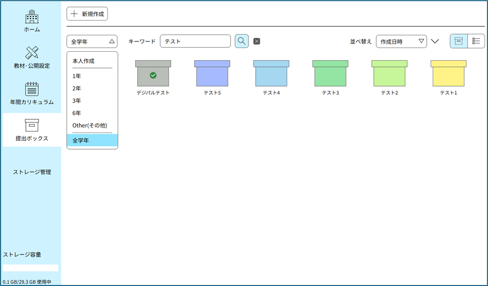 「全学年」のリストから「本人作成」または「学年」を選択し、必要に応じて「キーワード」を入力して「検索」ボタンをクリックすると、関連する提出ボックスのリストが表示されます。