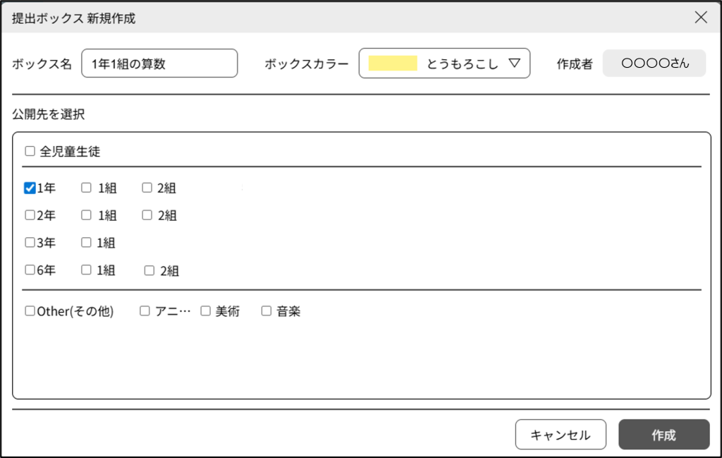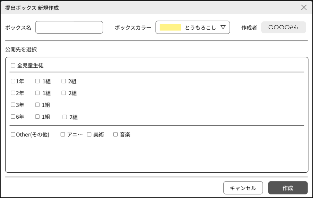 ② ボックス名を入力し、ボックスカラーを選択します。次に、「公開先を選択」枠で、公開したい学年・クラスを選択してください。