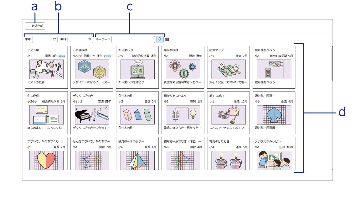 サイドバーで「教材・公開設定」を選択したときの画面について説明します。 新規作成教材を新規作成する際にクリックします。 学年/教科表示する教材を学年、教科、またはその両方で絞り込みます。プルダウンで選択し、[]をクリックしてください。 キーワード表示する教科をキーワードで検索します。入力欄にキーワードを記入し、[]をクリックしてください。 教材教材の詳細を表示します。