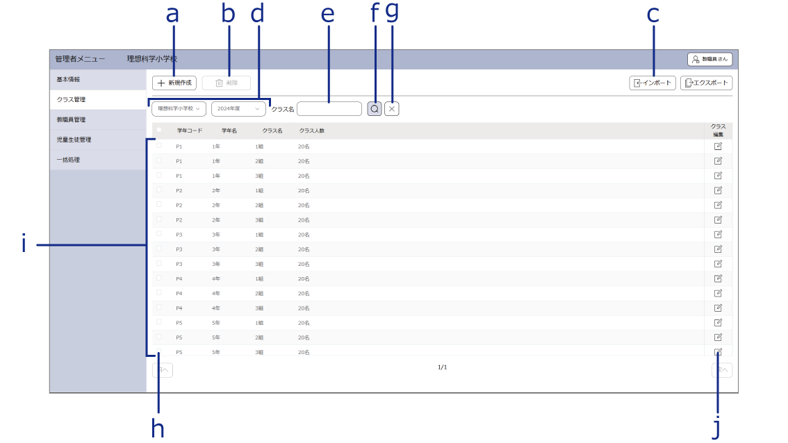 クリックするとチェックが付きます。アカウント一つ以上にチェックが付くと、上記bの[削除]ボタンが有効になります。 - クラス一覧