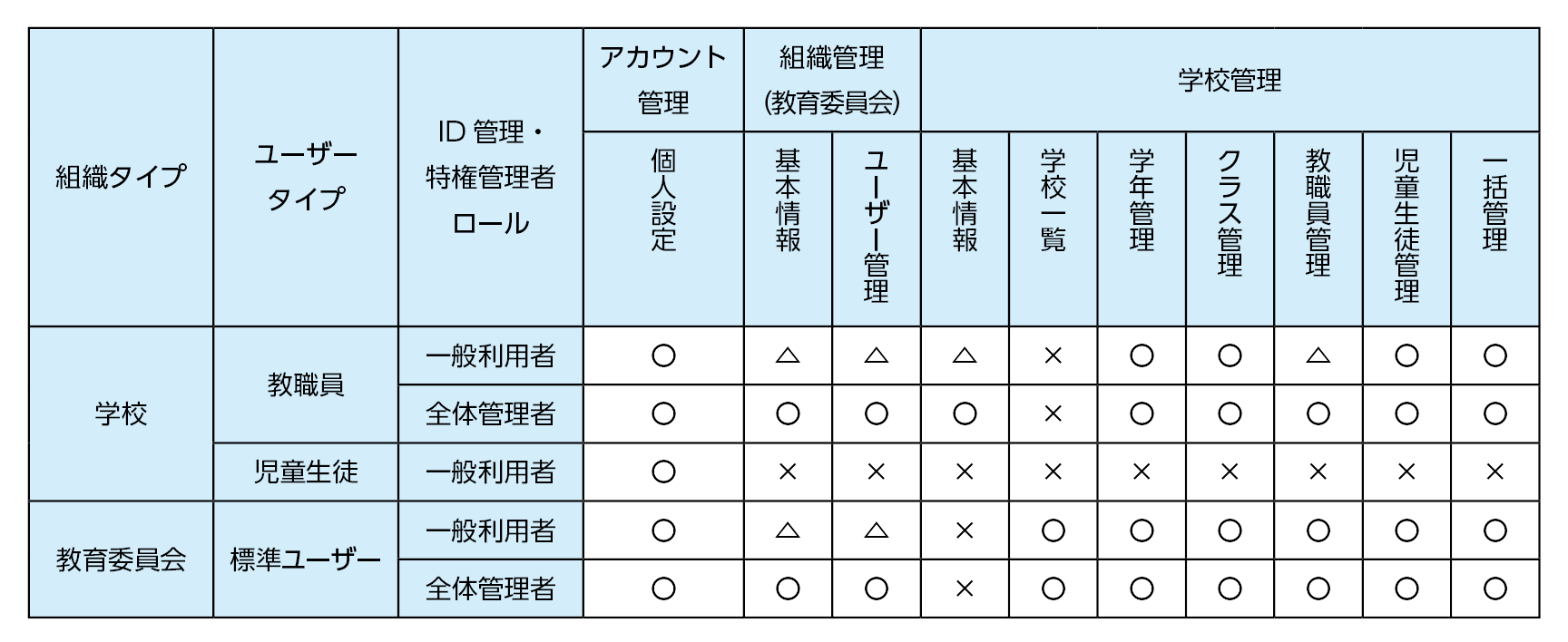 管理者の種類による各項目の編集権限は以下のとおりです。
