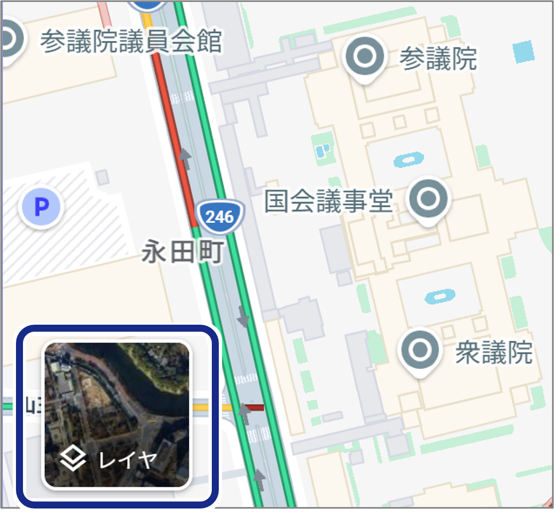 ①Googleマップの[レイヤ]をクリックしてストリートビューを表示します。