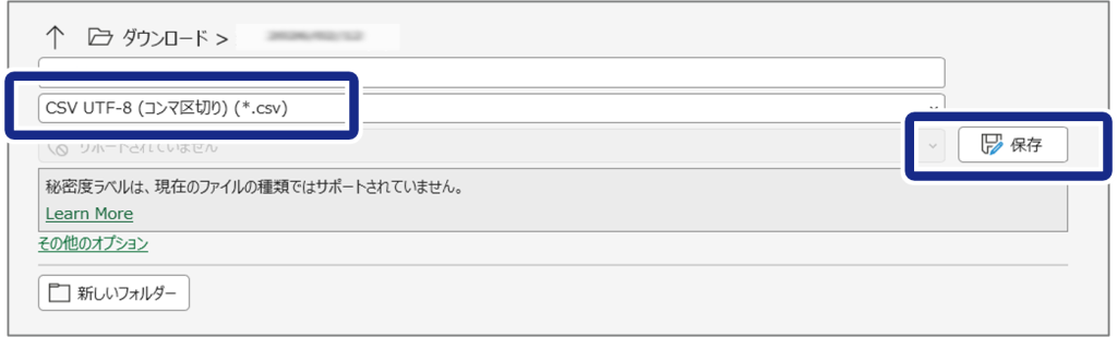編集が完了したら、[名前を付けて保存]を選択します。ファイル形式のプルダウンから[CSV UTF-8 (コンマ区切り) (.csv)]を指定して保存してください。