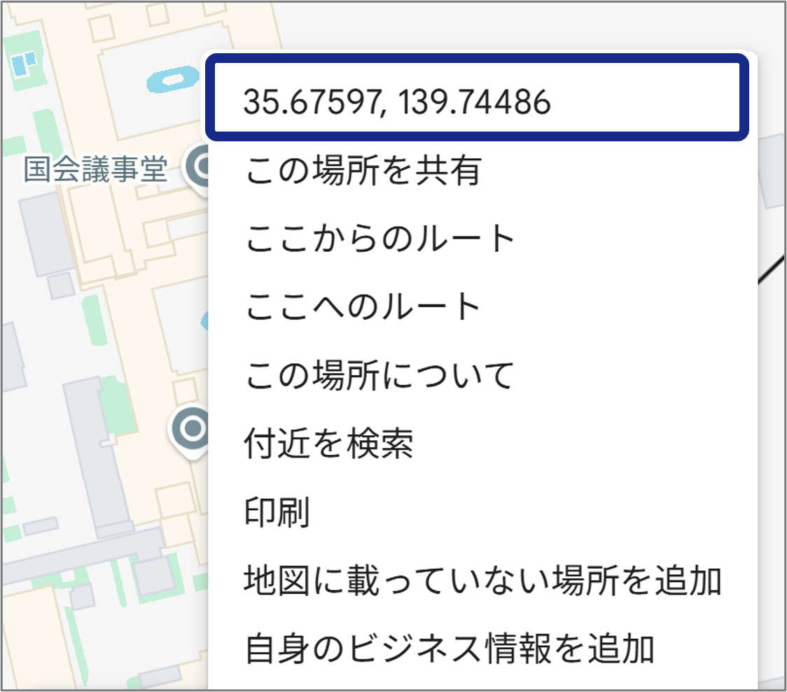 ③メニュー最上部の[緯度・経度](数値)をクリックしてコピーし、指定の枠に貼り付けます。