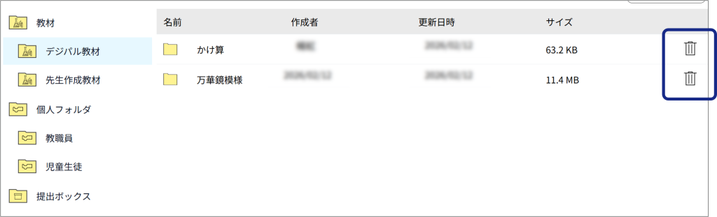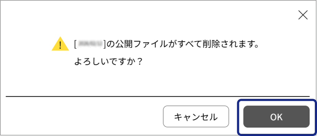 アップロードしたファイルを一覧から削除します。 1[ストレージ管理]をクリックする。 2ファイルまたはフォルダを選び、をクリックする。 フォルダのボタンをクリックすると、フォルダ内のファイルが全て削除されます。以下のダイアログボックスが表示されます。 3削除する場合は[OK]をクリックする。