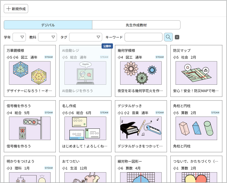 「デジパル」タブを選択し、表示された教材一覧から選びます。 - 先生作成教材で絞り込む