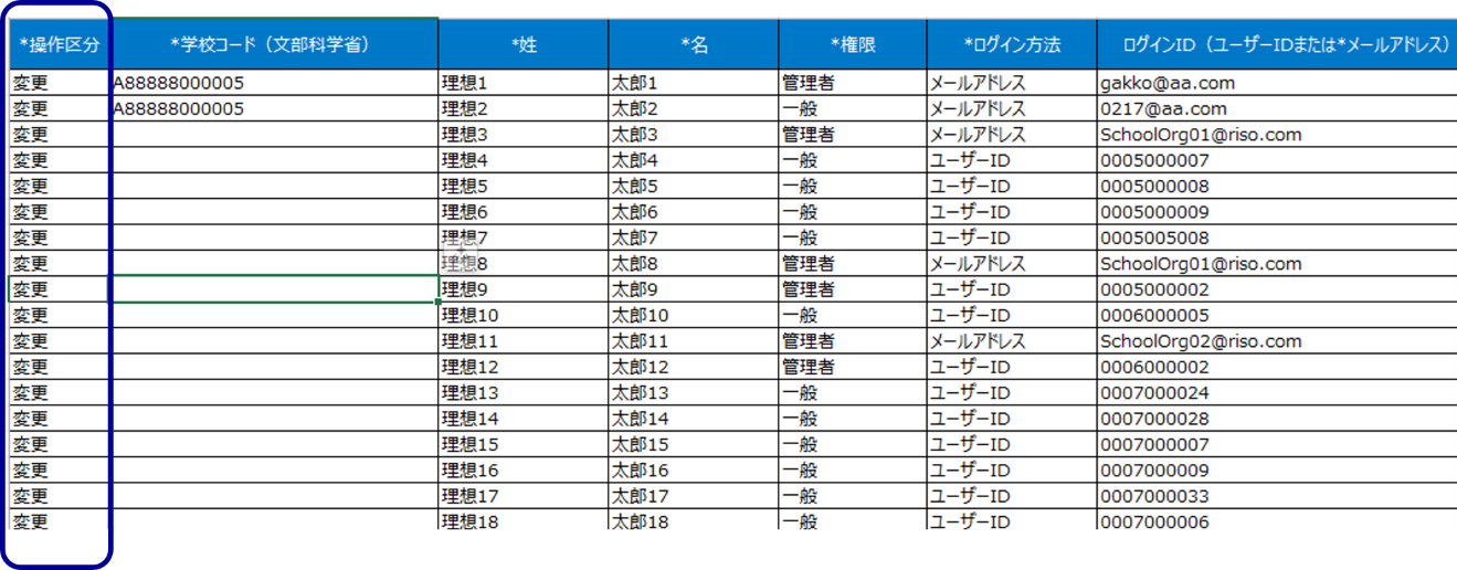 - ファイルの 「操作区分」をすべて「変更」 に設定し、必要な項目を修正します 。