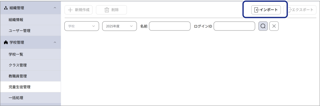 各管理画面(クラス/教職員/児童生徒/ユーザー管理)の右上の [インポート] ボタンをクリックします 。
