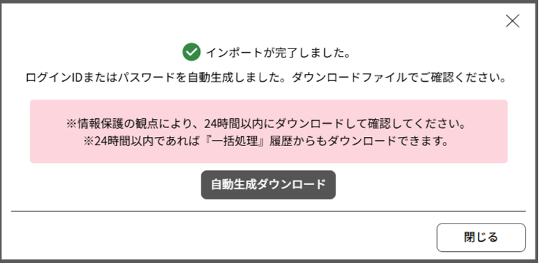1.完了画面の [自動生成ダウンロード] をクリックし、ID・パスワードを必ず確認してください 。