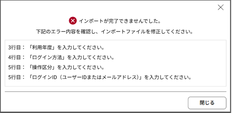 その後、再度インポートを実行します 。 - 「システムエラーが発生しました」と表示された場合は、エラー番号を控えてお問い合わせフォームへご連絡ください。